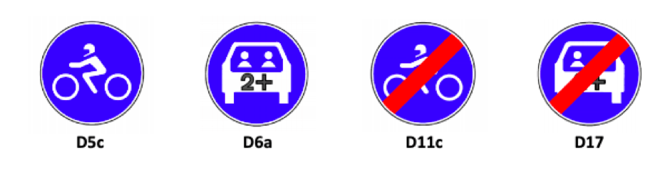 > D6a – Lane reserved for vehicles with high occupancy rate: indication of a traffic lane reserved exclusively for the circulation of vehicles carrying two or more people including the driver;