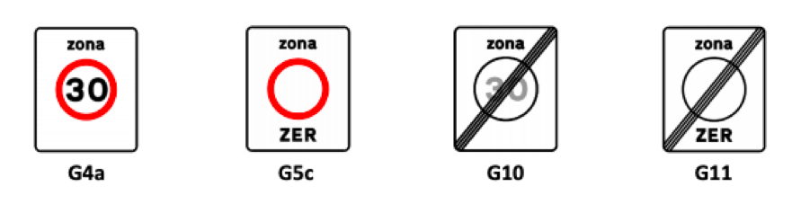 > G4a – 30hm/h zone: indication of entry into a 30 km/h zone in which traffic calming devices are applied in order to limit the maximum driving speed to 30 km/h;